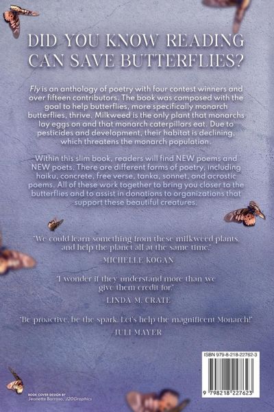 Did you know reading can help save butterflies? Fly is an anthology of poetry with four contest winners and over fifteen contributors. The book was composed with the goal to help butterflies, more specifically monarch butterflies, thrive. Milkweed is the only plant that monarchs lay eggs on and that monarch caterpillars eat. Due to pesticides and development, their habitat is declining, which threatens the monarch population. Within this slim book, readers will find NEW poems and NEW poets. There are different forms of poetry, including haiku, concrete, free verse, tanka, sonnet, and acrostic poems. All of these work together to bring you closer to the butterflies and to assist in donations to organizations that support these beautiful creatures. "We could learn something from these milkweed plants, and help the planet all at the same time-" -Michelle Kogan "I wonder if they understand more than we give them credit for." -Linda M. Crate "Be proactive, be the spark. Let's help the magnificent Monarch!" -Juli Mayer