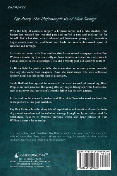 Fly Away: The Metamorphosis of Dina Savage With the help of cosmetic surgery, a brilliant career and a fake identity, Dina Savage has escaped her troubled past and crafted a new and exciting life for herself. But a hot date with a talented and handsome young artist reawakens tragic events from her childhood and leads her into a downward spiral of violence and revenge. A chance encounter with Dina and her date leaves retired newspaper writer Tom Williams wondering who she really is. From Atlanta he traces her roots back to a small hamlet in the Mississippi Delta and a twenty-year-old unsolved murder. As Dina's fight for justice unfolds, she encounters an adversary more powerful than any she could have imagined. Now, she must match wits with a Russian cybercriminal and his sordid cast of associates. Sarah Radford has agreed to represent the man accused of assaulting Dina. Despite her inexperience, the young attorney begins taking apart the State's case, only to discover that her client's wealthy father has his own agenda. In the end, as he comes to understand Dina, it is Tom who must confront the consequences of his past mistakes. Ray Dan Parker's breath-taking tale of exploitation and deceit explores the limits of personal ambition and the collateral damage brought on by our futile thirst for retribution. Readers of Parker's previous works will hear echoes of Tom Williams' search for meaning.