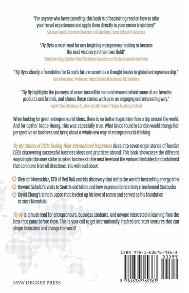 When looking for great entrepreneurial ideas, there is no better inspiration than a trip around the world. And for author Grace Huang, this was especially true. What Grace found in London would change her perspective on business and bring about a whole new way of entrepreneurial thinking. Fly By: Stories of CEOs Finding Their International Inspiration dives into seven origin stories of founder CEOs discovering successful business ideas and practices abroad. This book showcases the different ways inspiration may strike to take a business to the next level and the various blindsides (and solutions) that can come from all directions. You will read about:Dietrich Mateschitz, CEO of Red Bull, and his discovery that led to the world's bestselling energy drink Howard Schultz's visits to Seattle and Milan, and how espresso bars in Italy transformed Starbucks David Chang's stint in Japan that leveled up his love of ramen and served as his foundation to start Momofuku Fly By is a must-read for entrepreneurs, business students, and anyone interested in learning from the best that came before them. This is your call to get internationally inspired and start ventures that can shape industries and change the world!