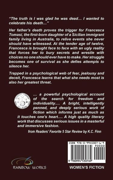 "The truth is I was glad he was dead... I wanted to celebrate his death..." Her father's death proves the trigger for Francesca Tomasi, the first-born daughter of a Sicilian immigrant family living in Australia, to relive events she never should have witnessed. At the tender age of twelve, Francesca is brought face to face with an ugly reality that forces her to bury secrets and wrestle with choices no one should ever have to make. Her struggle becomes one of survival as she defies attempts to silence her. Trapped in a psychological web of fear, jealousy and deceit, Francesca learns that what she needs most is also her greatest threat. Fly, Francesca, Fly is the story of one woman's struggle to free herself from the shackles of culture and history imposed on her by her Sicilian parents and extended family. When her father dies, a middle aged Australian-born woman of Sicilian parents writes a letter to her mother expressing her thoughts and feelings about events that took place in the family, in order to arrive at some internal peace. Unable to trust anyone, she describes how she struggled to survive on her own through PTSD, anxiety, depression, addiction, and suicidal tendencies.