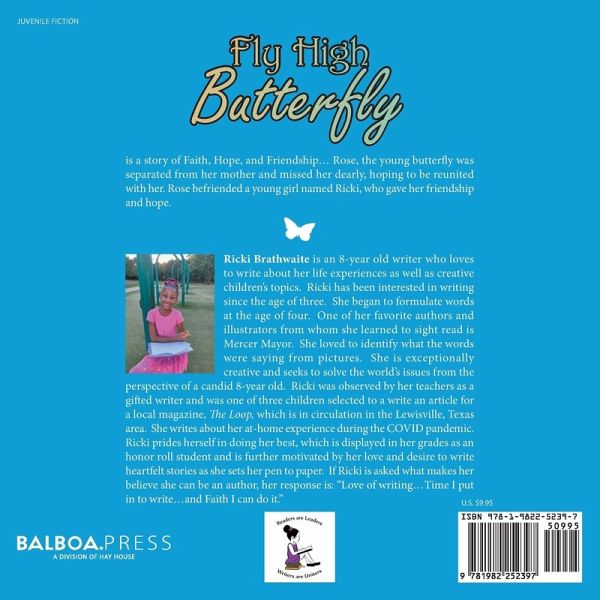 Fly High Butterfly is a story of Faith, Hope, and Friendship... Rose, the young butterfly was separated from her mother and missed her dearly, hoping to be reunited with her. Rose befriended a young girl named Ricki, whom gave her friendship and hope.