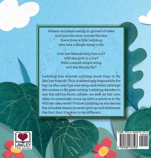 Where monkeys swing in groves of trees and parrots soar across the sky, there lives a tiny ladybug who has a single wing to fly. Can her friends help her out? Will she give it a try? With a small single wing, will she finally fly? Ladybug has wanted nothing more than to fly like her friends. This is seemingly impossible for her, as she only has one wing, and every attempt she makes to fly goes wrong. Ladybug decides to use the advice from others-as well as her own idea-to creatively come up with a solution to fly. Will her idea work? Follow Ladybug as she learns the valuable lesson to never give up and embraces the fact that it's okay to be different.