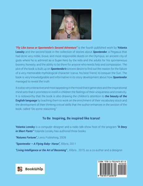 "Fly Like Icarus or Spontendor's Second Adventure" is the fourth published work by Yolanta Lensky and the second book in the collection of stories about Spontendor, a Pegasus that had done very noble, brave, and most responsible deeds on the Olympus, an ancient city of gods where he is admired as a Super-hero by the kids and the adults for his spontaneous bravery, honesty, and the ability to be there for anyone who needs help and compassion. The plot of the book is built up on Spontendor's sincere desire to find out the reason for the failure of a very memorable mythological character Icarus, his best friend, to conquer the Sun. The book is very knowledgeable and informative in its story development about how Spontendor managed to reveal the truth. It is also very interactive and most appealing in the mood that it generates and the inspirational mind-sets that it promotes to instill in children the feelings of their uniqueness and creativity. It is noteworthy that the book is also drawing the children's attention to the beauty of the English language by teaching them to work on the enrichment of their vocabulary stock and the development of their thinking critical skills that the author enhances in the section of the book, called "Do some reasoning." To Be Inspiring, Be inspired like Icarus!