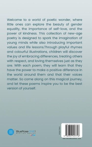 Welcome to a world of poetic wonder, where little ones can explore the beauty of gender equality, the importance of self-love, and the power of kindness. This collection of new-age poetry is designed to spark the imagination of young minds while also introducing important values and life lessons. Through playful rhymes and colourful illustrations, children will discover the joy of embracing differences, treating others with respect, and loving themselves just as they are. With each poem, they will learn that they have the power to make a positive difference in the world around them and that their voices matter. So come along on this magical journey, and let these poems inspire you to be the best version of yourself.