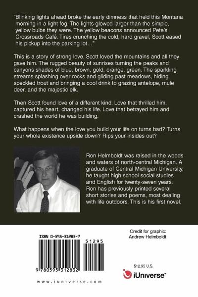 "Blinking lights ahead broke the early dimness that held this Montana morning in a light fog. The lights glowed larger than the simple, yellow bulbs they were. The yellow beacons announced Pete's Crossroads Café. Tires crunching the cold, hard gravel, Scott eased his pickup into the parking lot..." This is a story of strong love. Scott loved the mountains and all they gave him. The rugged beauty of sunrises turning the peaks and canyons shades of blue, brown, gold, orange, green. The sparkling streams splashing over rocks and gliding past meadows, hiding speckled trout and bringing a cool drink to grazing antelope, mule deer, and the majestic elk. Then Scott found love of a different kind. Love that thrilled him, captured his heart, changed his life. Love that betrayed him and crashed the world he was building. What happens when the love you build your life on turns bad? Turns your whole existence upside down? Rips your insides out?
