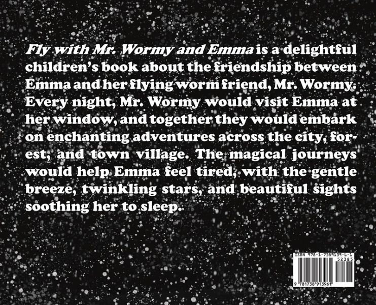 Fly with Mr. Wormy and Emma is a heartwarming children's story about an unlikely friendship between a little girl and a mystical flying worm creature. Every night, Mr. Wormy visits Emma at her window to help her fall asleep. He takes her on magical flights over the city, forest, and town village, showing her the beauty of the world and helping her feel sleepy. But one night, Emma isn't there, and Mr. Wormy sets out on a mission to find her. He searches high and low, determined to reunite with his best friend. Finally, Emma surprises him by showing up holding a flashlight and apologizing for forgetting to tell him about her camping trip. In the end, the two friends share a warm hug, and Mr. Wormy is overjoyed to have found his best friend safe and sound.