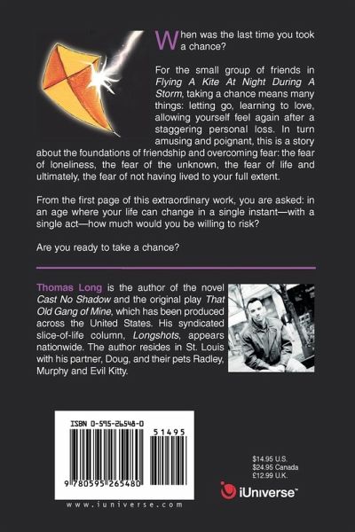 When was the last time you took a chance? For the small group of friends in Flying A Kite At Night During A Storm, taking a chance means many things: letting go, learning to love, allowing yourself feel again after a staggering personal loss. In turn amusing and poignant, this is a story about the foundations of friendship and overcoming fear: the fear of loneliness, the fear of the unknown, the fear of life and ultimately, the fear of not having lived to your full extent. From the first page of this extraordinary work, you are asked: in an age where your life can change in a single instant with a single act how much would you be willing to risk? Are you ready to take a chance?