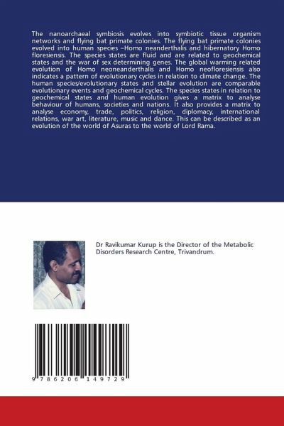 The nanoarchaeal symbiosis evolves into symbiotic tissue organism networks and flying bat primate colonies. The flying bat primate colonies evolved into human species -Homo neanderthalis and hibernatory Homo floresiensis. The species states are fluid and are related to geochemical states and the war of sex determining genes. The global warming related evolution of Homo neoneanderthalis and Homo neofloresiensis also indicates a pattern of evolutionary cycles in relation to climate change. The human species/evolutionary states and stellar evolution are comparable evolutionary events and geochemical cycles. The species states in relation to geochemical states and human evolution gives a matrix to analyse behaviour of humans, societies and nations. It also provides a matrix to analyse economy, trade, politics, religion, diplomacy, international relations, war art, literature, music and dance. This can be described as an evolution of the world of Asuras to the world of Lord Rama.