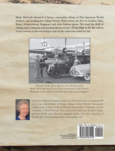 The author shares her personal acquaintance with Marie McGrath. Marie McGrath dreamed of being a stewardess, flying on Pan American World Airlines, and speaking her college French. When hired, she flew to London, Paris, Rome, Johannesburg, Singapore, and other faraway places. She loved the thrill of visiting many countries and meeting famous people. Flying High in the Sky reflects on her journey as she was living it, and on the crash that ended her life. Marie McGrath was a stewardess and among the 44 victims on Pan Am Flight 7 that crashed in the Pacific Ocean in 1957. Mystery still surrounds the crash.