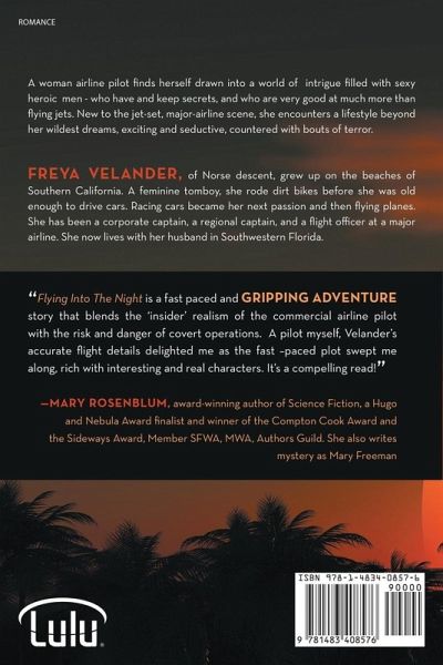A woman airline pilot finds herself drawn into a world of intrigue filled with sexy heroic men - who have and keep secrets, and who are very good at much more than flying jets. New to the jet-set, major-airline scene, she encounters a lifestyle beyond her wildest dreams, exciting and seductive, countered with bouts of terror. Freya Velander, of Norse descent, grew up on the beaches of Southern California. A feminine tomboy, she rode dirt bikes before she was old enough to drive cars. Racing cars became her next passion and then flying planes. She has been a corporate captain, a regional captain, and a flight officer at a major airline. She now lives with her husband in Southwestern Florida.