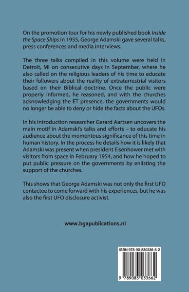 On the promotion tour for his newly published book Inside the Space Ships in 1955, George Adamski gave several talks, press conferences and media interviews. The three talks compiled in this volume were held in Detroit, MI on consecutive days in September, where he also called on the religious leaders of his time to educate their followers about the reality of extraterrestrial visitors based on their Biblical doctrine. Once the public were properly informed, he reasoned, and with the churches acknowledging the ET presence, the governments would no longer be able to deny or hide the facts about the UFOs. In his introduction researcher Gerard Aartsen uncovers the main motif in Adamski's talks and efforts - to educate his audience about the momentous significance of this time in human history. In the process he details how it is likely that Adamski was present when president Eisenhower met with visitors from space in February 1954, and how he hoped to put public pressure on the governments by enlisting the support of the churches. This shows that George Adamski was not only the first UFO contactee to come forward with his experiences, but he was also the first UFO disclosure activist.