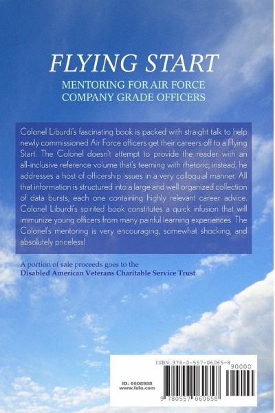 Colonel Liburdi's fascinating book is packed with straight talk to help newly commissioned Air Force officers get their careers off to a Flying Start. The Colonel doesn't attempt to provide the reader with an all-inclusive reference volume that's teeming with rhetoric; instead, he addresses a host of officership issues in a very colloquial manner. All that information is structured into a large and well organized collection of data bursts, each one containing highly relevant career advice. Colonel Liburdi's spirited book constitutes a quick infusion that will immunize young officers from many painful learning experiences. The Colonel's mentoring is very encouraging, somewhat shocking, and absolutely priceless!