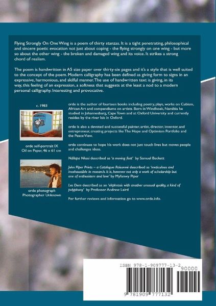 This is a poem of thirty stanzas. It is an unfeigned, penetrating, philosophical and sincere poetic evocation not just about coping - the flying strongly on one wing - but more so about the other wing - the broken and damaged wing and its voice. It strikes a strong chord of realism. The poem is handwritten in A5 size paper over thirty-six pages and it's a style that is well suited to the concept of the poem. Modern calligraphy has been defined as giving 'form to signs in an expressive, harmonious, and skillful manner' and in the use of handwritten text is giving in its way this feeling of an expression, a softness that suggests at the least a nod to a modern personal calligraphy.