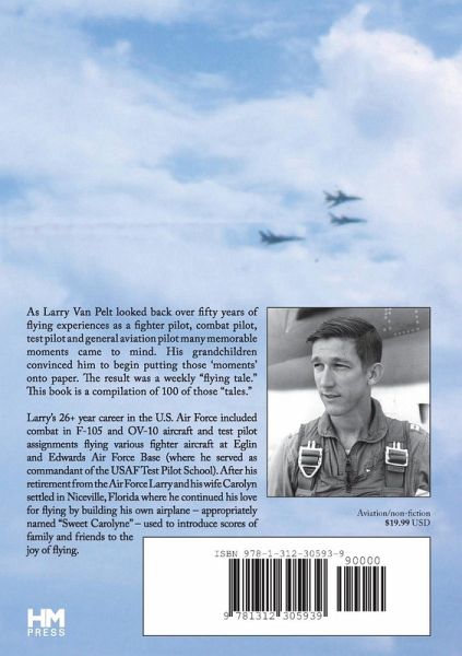 "Flying Tales" is a collection of random memorable moments encountered throughout an adventure filled flying career by now retired USAF colonel Larry Van Pelt. Adventures in 18 different aircraft types (F-100, F-105, F-104, F-4, A-7, OV-10, T-37, T-33, T-38, T-29, MB-339, A-1, QU-22, I-26 glider, Cessna 120&150, Twin Pioneer & AG5 Tiger) are found in 100 different "Tales." Enjoy the harrowing and the humorous, the excesses and the escapes as you fly with Larry into the adventure filled life of a fighter pilot, test pilot, combat pilot, general aviation pilot. Larry eventually piloted over 80 different types of aircraft. His Air Force career was highlighted by his time as commander of the USAF Test Pilot School.