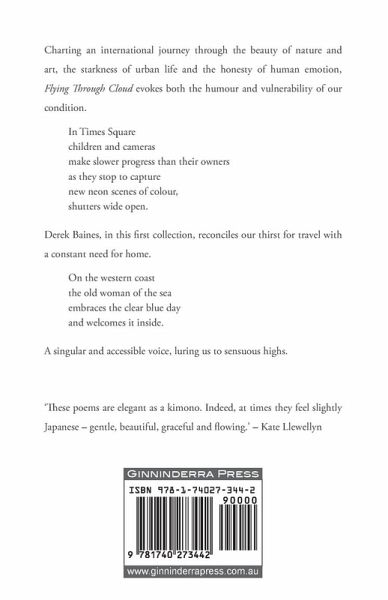 Charting an international journey through the beauty of nature and art, the starkness of urban life and the honesty of human emotion, Flying Through Cloud evokes both the humour and vulnerability of our condition. Derek Baines, in this first collection, reconciles our thirst for travel with a constant need for home. A singular and accessible voice, luring us to sensuous highs. ‘These poems are elegant as a kimono. Indeed, at times they feel slightly Japanese – gentle, beautiful, graceful and flowing.’ – Kate Llewellyn