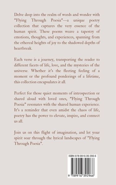 Delve deep into the realm of words and wonder with "Flying Through Poesia"-a unique poetry collection that captures the very essence of the human spirit. These poems weave a tapestry of emotions, thoughts, and experiences, spanning from the ethereal heights of joy to the shadowed depths of heartbreak.Each verse is a journey, transporting the reader to different facets of life, love, and the mysteries of the universe. Whether it's the fleeting feeling of a moment or the profound ponderings of a lifetime, this collection encapsulates it all.Perfect for those quiet moments of introspection or shared aloud with loved ones, "Flying Through Poesia" resonates with the shared human experience. It's a reminder that even amidst the chaos of life, poetry has the power to elevate, inspire, and connect us all.Join us on this flight of imagination, and let your spirit soar through the lyrical landscapes of "Flying Through Poesia". Copyright (c) 2023 Swan Charm Publishing