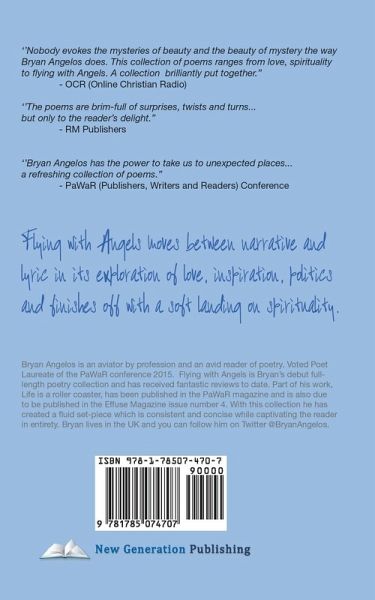 ''Nobody evokes the mysteries of beauty and the beauty of mystery the way Bryan Angelos does. This collection of poems ranges from love, spirituality to flying with Angels. A collection brilliantly put together.'' - OCR (Online Christian Radio) ''The poems are brim-full of surprises, twists and turns...... but only to the reader's delight.'' - RM Publishers ''Bryan Angelos has the power to take us to unexpected places .... A refreshing collection of poems.'' - PaWaR (Publishers, Writers and Readers) Conference. Flying with Angels moves between narrative and lyric in its exploration of love, inspiration, politics and finishes off with a soft landing on spirituality. Bryan Angelos is an aviator by profession and an avid reader of poetry. Voted Poet Laureate of the PaWaR conference 2015. Flying with Angels is Bryan's debut full-length poetry collection and has received fantastic reviews to date. Part of his work, Life is a roller coaster, has been published in the PaWaR magazine and is also due to be published in the Effuse Magazine issue number 4. With this collection he has created a fluid set-piece which is consistent and concise while captivating the reader in entirety. Bryan lives in the UK and you can follow him on Twitter @BryanAngelos.