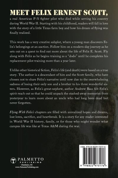 In this debut historical fiction novel centered on a young pilot in WWII, readers will get an up-close and authentic narrative of the excitement, horror, and sacrifice war brings to soldiers and their families. Meet Felix Ernest Scott, a real American P-51 fighter pilot who died while serving his country during World War II. Starting with his childhood, readers will fall in love with the story of a little Texas farm boy and how his dream of flying was finally realized. After the bombing of Pearl Harbor, Felix dropped out of the Agricultural & Mechanical College of Texas, leaving San Saba County's safety to learn how to become a pilot, protect his family, and serve his country. Fly along with Felix as he begins training as a "dodo" until he completes his replacement pilot training more than a year later. Unlike other historical fiction, Felix's life (and death) were based on a true story. The author is a descendant of him and the Scott family, who have chosen not to share Felix's narrative until now due to the overwhelming sadness of losing their only son and a brother to his three wonderful sisters. However, as Felix's great-nephew, author Andrew Bass felt Felix's spirit reach out so that he could unpack the stashed-away memories from yesteryear to learn more about an uncle who had long been dead but never forgotten. Flying with Felix's chapters are filled with unrealized hopes and dreams, lost loves, sacrifice, and heartbreak. It is a story for any reader interested in history, family, war, or the promise of fulfilling your purpose.