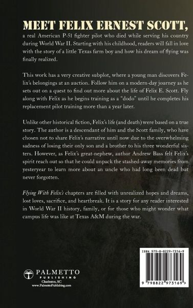 In this debut historical fiction novel centered on a young pilot in WWII, readers will get an up-close and authentic narrative of the excitement, horror, and sacrifice war brings to soldiers and their families. Meet Felix Ernest Scott, a real American P-51 fighter pilot who died while serving his country during World War II. Starting with his childhood, readers will fall in love with the story of a little Texas farm boy and how his dream of flying was finally realized. After the bombing of Pearl Harbor, Felix dropped out of the Agricultural & Mechanical College of Texas, leaving San Saba County's safety to learn how to become a pilot, protect his family, and serve his country. Fly along with Felix as he begins training as a "dodo" until he completes his replacement pilot training more than a year later. Unlike other historical fiction, Felix's life (and death) were based on a true story. The author is a descendant of him and the Scott family, who have chosen not to share Felix's narrative until now due to the overwhelming sadness of losing their only son and a brother to his three wonderful sisters. However, as Felix's great-nephew, author Andrew Bass felt Felix's spirit reach out so that he could unpack the stashed-away memories from yesteryear to learn more about an uncle who had long been dead but never forgotten. Flying with Felix's chapters are filled with unrealized hopes and dreams, lost loves, sacrifice, and heartbreak. It is a story for any reader interested in history, family, war, or the promise of fulfilling your purpose.