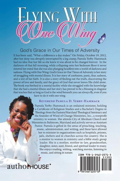 It has been said, What a difference a day makes. On Friday, October 19, 2012, after her sleep was abruptly interrupted by a leg cramp, Pamula Yerby-Hammack had no idea that her life as she knew it was about to be changed forever. In the darkness of that fall morning, while collapsing onto her bedroom floor it never entered her mind that she was also plunging headfirst into a world of darkness and sadness. Flying with One Wing: Gods Grace in Our Times of Adversity is her story of struggling with mental illness. It is her story of confusion, panic, fear, sadness, and a test of her faith. It is also a story of finding out the truth, discovering the power of love and family, and the grace of God that never leaves His child alone. The book was birthed in a mental facility while she struggled with the knowledge that she had a mental illness and her story has proved to be a blessing in disguise that teaches that as long as God is the wind beneath you can always fly, even if you have to do it with one wing.