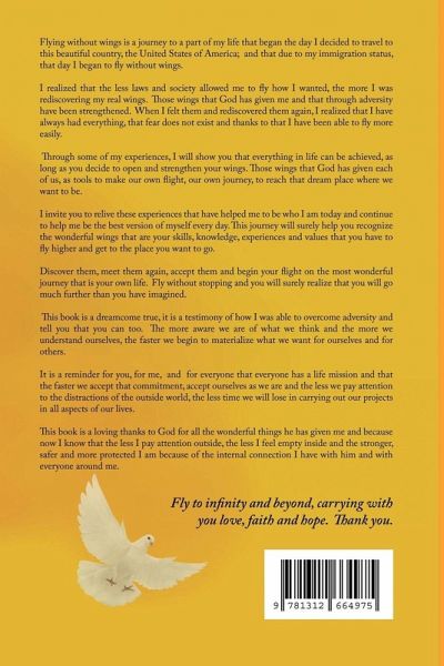 Flying without wings is a journey to a part of my life that began the day I decided to travel to this beautiful country, the United States of America; and due to my immigration status, that day I began to fly without wings. It is a reminder for us that everyone has a life mission and that the faster we accept that commitment, the less time we will lose in carrying out our projects in all aspects of life. Accepting ourselves as we are and at the same time giving us the opportunity to change using each life experience to improve and live fully and thus fly free with our wings given by God, wherever we are.