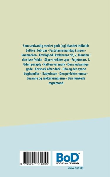 Som sædvanlig med et godt (og) blandet indhold: Softice i februar - Fastelavnsmandag i sneen - Snemarken - Kærlighed i kælderens tid, 2, Manden i den lyse frakke - Skyer trækker spor - Føljeton nr. 1, Uden paraply - Natten var mørk - Den sædvanlige gade - Korsbæk after dark - Oda og den tynde boghandler - I labyrinten - Den perfekte numse - Susanne og sukkerkringlerne - Den lænkede ægtemand