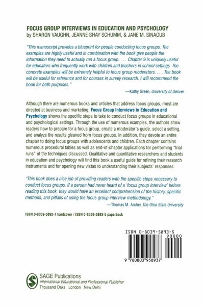 While there are many books that address focus groups, most are directed at business and marketing. This book differs by demonstrating the specific steps necessary to conduct focus groups in educational and psychological settings. Using numerous examples, the authors show how to prepare for a focus group, create a moderator's guide, select a setting and analyze results. In addition, there is a chapter on focus groups with children and adolescents. Each chapter contains procedural tables as well as applications for performing `trial runs' of the techniques discussed.