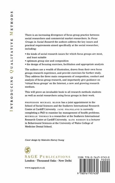 There is an increasing divergence of focus group practice between social researchers and commercial market researchers. This book addresses the key issues and practical requirements of the social researcher, namely: the kinds of social research issues for which focus groups are most and least suitable; optimum group size and composition; and the designing of focusing exercises, facilitation and appropriate analysis. The authors use examples, drawn from their own focus groups research experience, and provide exercises for further study. They address the three main components of composition, conduct and analysis in focus group research and also acknowledge the increasing impact the Internet has had on social research by covering the role and conduct of `virtual focus groups'.