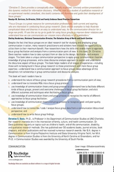 Despite the fact that focus groups are an ideal research tool for studying and employing group communication in action, many research practitioners and scholars have missed the opportunity to utilize them to their maximum benefit. Few researchers have the skills that enable them to approach focus group facilitation and analysis from a communication point of view. In this book, Dr. Christine Davis teaches readers how to take a project from an idea to the design, facilitation, and analysis stages. This book takes a unique communication perspective to apply group communication theories, knowledge of group processes, and a close discourse analysis approach to explain and understand the discursive aspect of focus groups. This book helps readers of all stages of experience - including those with no background in focus group research to those practitioners with more focus group expertise - understand how a communication approach to focus groups takes advantage of this discipline's rich scholarship in group communication and discourse analysis.¿ This book will teach readers how to a. understand the nature of focus group research procedures from a communication point of view; b. understand how to translate RQs into a focus group protocol; c. use knowledge of communication theory and group process to understand how to facilitate different kinds of focus groups, prevent and overcome challenges in focus group facilitation; and elicit different outcomes and techniques when facilitating a focus group; d. use knowledge of communication theory and group process to recognize the merits of different approaches to focus group facilitation; e. use knowledge of communication theory and group process to recognize good- and poor-quality focus groups; f. understand how to transcribe / code / analyze focus group data from a communication (discursive) perspective; and g. understand how to write focus group findings.