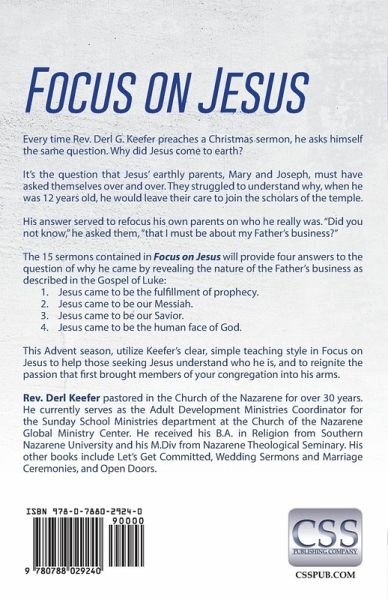 Every time Rev. Derl G. Keefer preaches a Christmas sermon, he asks himself the same question. Why did Jesus come to earth? It's the question that Jesus' earthly parents, Mary and Joseph, must have asked themselves over and over. They struggled to understand why, when he was 12 years old, he would leave their care to join the scholars of the temple. His answer served to refocus his own parents on who he really was."Did you not know," he asked them, "that I must be about my Father's business?" The 15 sermons contained in Focus on Jesus will provide four answers to the question of why he came by revealing the nature of the Father's business as described in the Gospel of Luke: Jesus came to be the fulfillment of prophecy. Jesus came to be our Messiah. Jesus came to be our Savior. Jesus came to be the human face of God. This Advent season, utilize Keefer's clear, simple teaching style in Focus on Jesus to help those seeking Jesus understand who he is, and to reignite the passion that first brought members of your congregation into his arms. Rev. Derl Keefer pastored in the Church of the Nazarene for over 30 years. He currently serves as the Adult Development Ministries Coordinator for the Sunday School Ministries department at the Church of the Nazarene Global Ministry Center. He received his B.A. in Religion from Southern Nazarene University and his M.Div from Nazarene Theological Seminary. His other books include Let's Get Committed, Wedding Sermons and Marriage Ceremonies, and Open Doors.