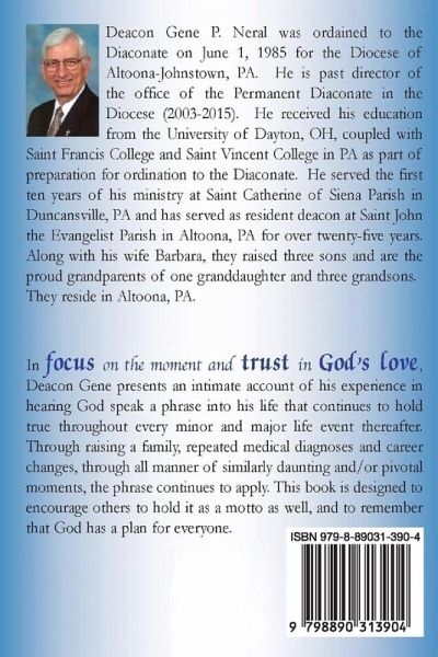 In focus on the moment and trust in God's love, Deacon Gene presents an intimate account of his experience in hearing God speak a phrase into his life that continues to hold true throughout every minor and major life event thereafter. Through raising a family, repeated medical diagnoses and career changes, through all manner of similarly daunting and/or pivotal moments, the phrase continues to apply. This book is designed to encourage others to hold it as a motto as well, and to remember that God has a plan for everyone.