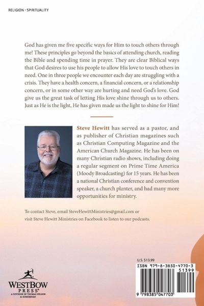 God has given me five specific ways for Him to touch others through me! These principles go beyond the basics of attending church, reading the Bible and spending time in prayer. They are clear Biblical ways that God desires to use his people to allow His love to touch others in need. One in three people we encounter each day are struggling with a crisis. They have a health concern, a financial concern, or a relationship concern, or in some other way are hurting and need God's love. God give us the great task of letting His love shine through us to others. Just as He is the light, He has given made us the light to shine for Him!