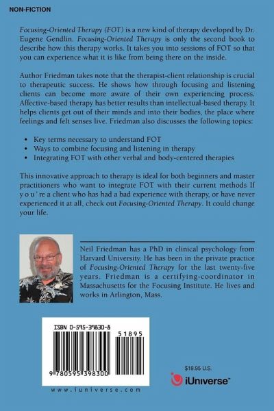 Focusing-Oriented Therapy (FOT) is a new kind of therapy developed by Dr. Eugene Gendlin. Focusing-Oriented Therapy is only the second book to describe how this therapy works. It takes you into sessions of FOT so that you can experience what it is like from being there on the inside. Author Friedman takes note that the therapist-client relationship is crucial to therapeutic success. He shows how through focusing and listening clients can become more aware of their own experiencing process. Affective-based therapy has better results than intellectual-based therapy. It helps clients get out of their minds and into their bodies, the place where feelings and felt sense live. Friedman also discusses the following topics: Key terms necessary to understand FOT Ways to combine focusing and listening in therapy Integrating FOT with other verbal and body-centered therapies This innovative approach to therapy is ideal for both beginners and master practitioners who want to integrate FOT with their current methods If you're a client who has had a bad experience with therapy, or have never experienced it at all, check out Focusing-Oriented Therapy, it could change your life.