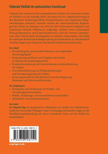 Volquart Stoy untersucht den sozialpolitischen Einfluss der deutschen Länder im Hinblick auf die wichtige Rolle, die ihnen bei der Angebotssteuerung in den Bereichen Kindertagesstätten, Krankenhäusern und stationären Pflegeeinrichtungen zukommt. Erstmals werden die unterschiedlichen Regelungen der Länder im Zeitraum von 1991 bis 2013 systematisch verglichen und bedeutsame föderale Differenzen aufgezeigt. Anhand einer umfassenden Dokumentenanalyse und Experteninterviews wird der Versuch unternommen, diese Unterschiede theoriegeleitet zu erklären. Insbesondere wird dabei der informale Bereich der Politikgestaltung auf Landesebene im Machtdreieck zwischen Regierung, Parlament und Ministerialbürokratie beleuchtet.