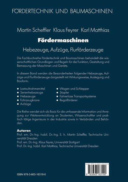 Prof. em. Dr.-Ing. habil. Dr.-Ing. E. h. Martin Scheffler ist an der TU Dresden am Institut für Fördertechnik tätig. Prof. Dr.-Ing. Klaus Feyrer arbeitet am Institut für Fördertechnik, Getriebetechnik. Prof. Dr.-Ing. habil. Karl Matthias ist ebenfalls am Institut für Fördertechnik der TU Dresden tätig.