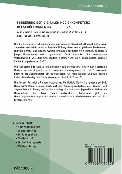 Die Digitalisierung ist mittlerweile aus unserer Gesellschaft nicht mehr wegzudenken und erhält auch im Bereich Bildung einen immer größeren Stellenwert. Digitale Geräte sind allgegenwärtig und ein jeder kann sie bedienen, besonders junge Erwachsene und Jugendliche. Doch bedeutet die umfassende Verfügbarkeit von digitalen Medien automatisch eine ausgebildete digitale Medienkompetenz bei SuS?Wie schätzen SuS selbst ihre digitale Medienkompetenz ein? Welche digitalen Geräte setzen Jugendliche in welchen Nutzungsbereichen ein? Inwieweit besteht bei Jugendlichen ein Bewusstsein für Fake News? Und wie können Lehrkräfte die digitale Medienkompetenz bei SuS fördern?Die Autorin Franziska Reiners beleuchtet die digitale Medienkompetenz bei SuS. Dazu wirft Reiners einen Blick auf das Nutzungsverhalten von Kindern und Jugendlichen in Bezug auf Medien und legt dar, inwieweit jugendliche Nutzer ein Bewusstsein für Fake News entwickeln. Außerdem gibt sie Handlungsempfehlungen, mit denen Lehrkräfte die Medienkompetenz bei SuS fördern können.Aus dem Inhalt:-Falschmeldungen;-Digital Natives;-Bildungspolitik;-Medienkritik;-Digital Immigrants;-Medienbildung