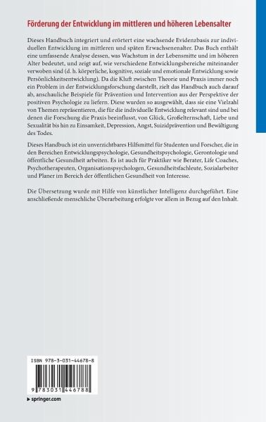 Kapitel 1: Einführung: Anwendung der Prinzipien der Positiven Psychologie zur Förderung der Entwicklung in der Lebensmitte und im höheren Alter.- Kapitel 2: Paradigmenwechsel: Von der Disengagement-Theorie zu Modellen des positiven Alterns.- Kapitel 3: Über Entwicklung nachdenken: Definition von Kriterien, Erforschung von Prozessen und Bewertung von Veränderungen.- Kapitel 4: Interventionen am Scheideweg: Von der Verhinderung des Verfalls zur Förderung des Wachstums.- Kapitel 5: Körperliche Entwicklung in der Lebensmitte und im höheren Alter: Förderung der Gesundheit als individuelles Gut - Kapitel 6: Kognitive Entwicklung im mittleren und höheren Lebensalter: Von der Neuroplastizität bis zur Selbstwirksamkeit und einer positiven Einstellung zum Altern.- Kapitel 7: Soziale Entwicklung im mittleren und höheren Alter: Wie soziale Rollen und Beziehungen die persönliche Entwicklung prägen.- Kapitel 8: Emotionale Entwicklung im mittleren und höheren Alter: Sind wir im Alter glücklicher?- Kapitel 9: Persönlichkeitsentwicklung in der Lebensmitte und im Alter: Mission Impossible oder ein notwendiges Ziel für positives Altern?.- Kapitel 10: Umgang mit Altersdiskriminierung und Entwicklung im mittleren und höheren Alter.- Kapitel 11: Liebe kennt kein Alter: Förderung romantischer Beziehungen in der Lebensmitte und im höheren Alter.- Kapitel 12: Sexualität und Entwicklung: Auf dem Weg zu einer erfüllenden Sexualität in der Lebensmitte und im höheren Alter.- Kapitel 13: Die Suche nach Glück: Anwendung der Prinzipien der Positiven Psychologie zur Förderung des Glücks in der Lebensmitte und im Alter.- Kapitel 14: Der Umgang mit Einsamkeit in der Lebensmitte und im Alter: Steigerung der sozialen Fähigkeiten und der Verbundenheit.- Kapitel 15: Die Rolle der Großeltern: Entwicklungsmöglichkeiten und Fallstricke.- Kapitel 16: Schmerzbewältigung: Entwicklungsmöglichkeiten im mittleren und höheren Lebensalter.- Kapitel 17: Angststörungen im höheren Lebensalter: Prävention und Intervention aus der Perspektive der Positiven Psychologie.- Kapitel 18: Depressionen im Alter: Prävention und Intervention aus der Sicht der Positiven Psychologie.- Kapitel 19: Suizidprävention im höheren Lebensalter: Eine Sichtweise der Positiven Psychologie.- Kapitel 20: Entwicklung von Interventionen der Positiven Psychologie zur Vorbereitung auf den Tod und zur Trauerarbeit bei älteren Erwachsenen.- Kapitel 21: Schlussfolgerung: Altern und Entwicklung aus der Sicht der Positiven Psychologie.