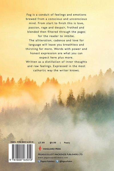 Fog is a conduit of feelings and emotions brewed from a conscious and unconscious mind. From start to finish this is love, passion, rage and despair, frothed and blended then filtered through the pages for the reader to imbibe. The alliteration, cadence and love for language will leave you breathless and thirsting for more. Words with power and honest expression are what you can expect here plus more. Written as a distillation of inner thoughts and raw feelings. Expressed in the most cathartic way the writer knows.