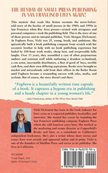The heyday of small press publishing in San Francisco lives again This memoir that reads like fiction recounts the never-before-told story of the heyday of small presses in the 1980s and 1990s in San Francisco when Bay Area presses-armed with arrogance and personal computers—took the publishing field. The invention of the desktop computer was akin to the invention of printing press at the end of the Middle Ages, heralding a renaissance in the book business and ushering in a hotbed of creativity recognized even by New York City, the long-held center of all things publishing. In these glory days, presses like Foghorn Press, Nolo Press, Ten Speed Press, Heyday Books, Wilderness Press, New World Library, and Chronicle Books were a just few of many to partner with independent neighborhood bookstores to stage the first San Francisco Bay Area Book Festival which drew 35,000 readers. This is the often comic story of one of those presses and its intrepid publisher, Vicki Morgan. At Foghorn Press, Vicki was 25, young and brash and ambitious. She set out to quixotically build a book publishing company from scratch with her eccentric brother to help. As part of their optimistic Morgan heritage, the siblings employed every strategy they had to grow Foghorn Press with no capital, 100-hour work weeks, cheap beer, irrepressible belly laughs, and no book publishing experience. Over 13 years, they assembled a cast of often preposterous authors and resistant staff while surviving a drunken ex-husband, a con artist, calculating distributors, a fleet of good ol' boys, terrible cash flow, and their own differing aspirations. Books were brought to market and miraculously sold from their offices in the Boiler Room until Foghorn became a resounding success with sales, media, acclaim. But of course, the story doesn’t end there.
