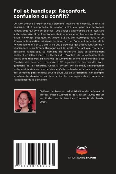 Ce livre cherche à explorer deux éléments majeurs de l'identité, la foi et le handicap, et à comprendre la relation entre eux pour les personnes handicapées qui sont chrétiennes. Une analyse approfondie de la littérature a été entreprise et neuf personnes (huit femmes et un homme souffrant de divers handicaps physiques et sensoriels) ont été interrogées dans le but d'explorer la question principale de la recherche: Comment l'adoption de la foi chrétienne influence-t-elle la vie des personnes qui s'identifient comme « handicapées » en Grande-Bretagne au 21e siècle ? En tant que chrétien et personne handicapée, ce domaine de recherche était personnellement pertinent et intéressant. Les thèmes du réconfort, de la confusion et du conflit sont ressortis de l'analyse documentaire et ont été cohérents avec l'analyse des entretiens. L'analyse a été organisée en fonction des sous-questions de la recherche. Celles-ci portent sur l'identité, l'interprétation biblique et la vie avec une déficience. Cette recherche a permis de dégager des domaines passionnants pour la poursuite de la recherche. Par exemple, la nécessité d'explorer les liens entre les «voyages» des chrétiens et l'expérience de la déficience.