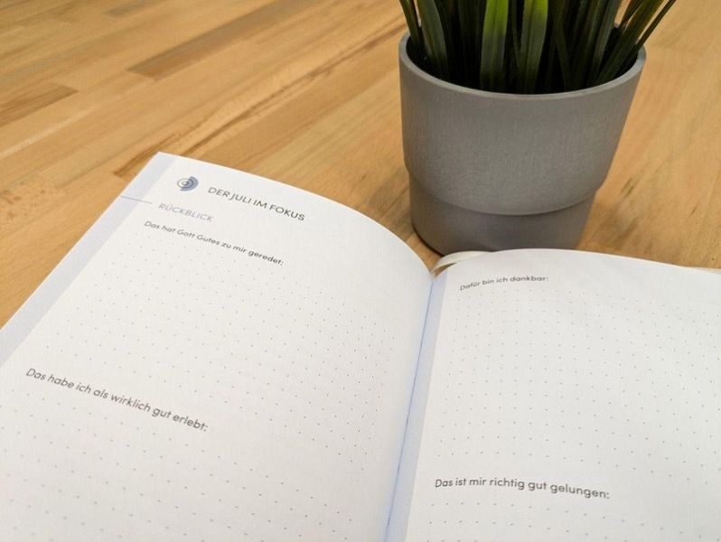 Ganz vorn befindet sich eine Zusage Gottes für jeden Monat mit etwas Platz für Notizen dazu; darauf folgt eine Doppelseite, die zu einem Rückblick auf das vergangene Jahr, zum Ziele-Setzen, persönlichem Jahresvers-Eintragen und ein paar lieben Worten für sich selbst einlädt.