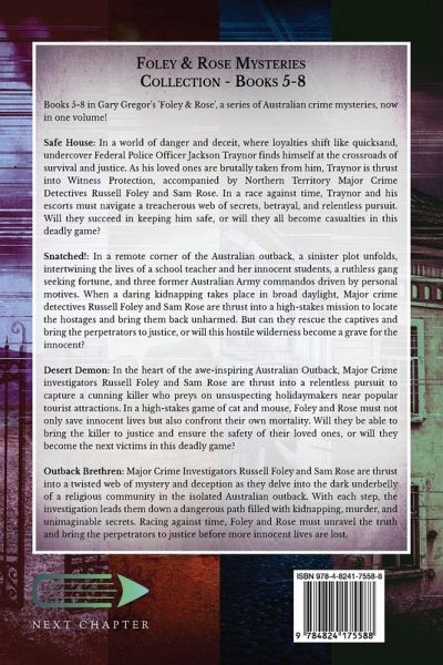 Books 5-8 in Gary Gregor's 'Foley & Rose', a series of Australian crime mysteries, now in one volume! Safe House: In a world of danger and deceit, where loyalties shift like quicksand, undercover Federal Police Officer Jackson Traynor finds himself at the crossroads of survival and justice. As his loved ones are brutally taken from him, Traynor is thrust into Witness Protection, accompanied by Northern Territory Major Crime Detectives Russell Foley and Sam Rose. In a race against time, Traynor and his escorts must navigate a treacherous web of secrets, betrayal, and relentless pursuit. Will they succeed in keeping him safe, or will they all become casualties in this deadly game? Snatched!: In a remote corner of the Australian outback, a sinister plot unfolds, intertwining the lives of a school teacher and her innocent students, a ruthless gang seeking fortune, and three former Australian Army commandos driven by personal motives. When a daring kidnapping takes place in broad daylight, Major crime detectives Russell Foley and Sam Rose are thrust into a high-stakes mission to locate the hostages and bring them back unharmed. But can they rescue the captives and bring the perpetrators to justice, or will this hostile wilderness become a grave for the innocent? Desert Demon: In the heart of the awe-inspiring Australian Outback, Major Crime investigators Russell Foley and Sam Rose are thrust into a relentless pursuit to capture a cunning killer who preys on unsuspecting holidaymakers near popular tourist attractions. In a high-stakes game of cat and mouse, Foley and Rose must not only save innocent lives but also confront their own mortality. Will they be able to bring the killer to justice and ensure the safety of their loved ones, or will they become the next victims in this deadly game? Outback Brethren: Major Crime Investigators Russell Foley and Sam Rose are thrust into a twisted web of mystery and deception as they delve into the dark underbelly of a religious community in the isolated Australian outback. With each step, the investigation leads them down a dangerous path filled with kidnapping, murder, and unimaginable secrets. Racing against time, Foley and Rose must unravel the truth and bring the perpetrators to justice before more innocent lives are lost.