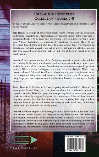 Books 5-8 in Gary Gregor's 'Foley & Rose', a series of Australian crime mysteries, now in one volume! Safe House: In a world of danger and deceit, where loyalties shift like quicksand, undercover Federal Police Officer Jackson Traynor finds himself at the crossroads of survival and justice. As his loved ones are brutally taken from him, Traynor is thrust into Witness Protection, accompanied by Northern Territory Major Crime Detectives Russell Foley and Sam Rose. In a race against time, Traynor and his escorts must navigate a treacherous web of secrets, betrayal, and relentless pursuit. Will they succeed in keeping him safe, or will they all become casualties in this deadly game? Snatched!: In a remote corner of the Australian outback, a sinister plot unfolds, intertwining the lives of a school teacher and her innocent students, a ruthless gang seeking fortune, and three former Australian Army commandos driven by personal motives. When a daring kidnapping takes place in broad daylight, Major crime detectives Russell Foley and Sam Rose are thrust into a high-stakes mission to locate the hostages and bring them back unharmed. But can they rescue the captives and bring the perpetrators to justice, or will this hostile wilderness become a grave for the innocent? Desert Demon: In the heart of the awe-inspiring Australian Outback, Major Crime investigators Russell Foley and Sam Rose are thrust into a relentless pursuit to capture a cunning killer who preys on unsuspecting holidaymakers near popular tourist attractions. In a high-stakes game of cat and mouse, Foley and Rose must not only save innocent lives but also confront their own mortality. Will they be able to bring the killer to justice and ensure the safety of their loved ones, or will they become the next victims in this deadly game? Outback Brethren: Major Crime Investigators Russell Foley and Sam Rose are thrust into a twisted web of mystery and deception as they delve into the dark underbelly of a religious community in the isolated Australian outback. With each step, the investigation leads them down a dangerous path filled with kidnapping, murder, and unimaginable secrets. Racing against time, Foley and Rose must unravel the truth and bring the perpetrators to justice before more innocent lives are lost.