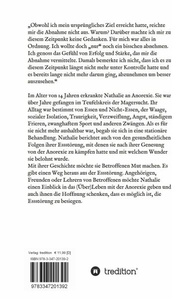 Als Teenager rutschte Nathalie Weber durch eine Diät in die Anorexie. Obwohl sie ihr ursprüngliches Gewichtsziel erreicht hatte, konnte sie nicht aufhören, abzunehmen. Ohne es damals zu bemerken, war Nathalie bereits gefangen in dem Teufelskreis der Anorexie. Ihr Alltag war bestimmt von Gedanken zu Essen und Nicht-Essen, der Kontrolle und genauen schriftlichen Dokumentation ihres Essverhaltens und von bestimmten Zwängen in Bezug auf die Nahrungsaufnahme, die Bewegung sowie die Kontrolle des Essverhaltens Anderer. Drei Jahre (über)lebte Nathalie mit der Anorexie bis sie an einem Punkt angelangte, an dem sie wirklich etwas verändern und gesund werden wollte. Nathalie entschied sich aus eigenem Willen heraus, in eine Klinik zu gehen. Die stationäre Behandlung war ein sehr wichtiger Schritt auf ihrem Weg, die Anorexie hinter sich zu lassen. Nach der stationären Behandlung war sie nicht sofort komplett gesund. Mehrmals war Nathalie zufrieden, stellte aber im Nachhinein fest, dass sie in gewisser Hinsicht noch ein Stück der Anorexie festgehalten hatte, auch wenn sie keinen Rückfall erlitt. Sie ging ihren Weg weiter und konnte immer wieder Schritte gehen, die die Anorexie noch mehr in den Hintergrund rücken ließen. Sechs Jahre nach Ausbruch der Erkrankung konnte Nathalie sagen, dass sie komplett gesund ist. Damit ist ihre Geschichte aber nicht zu Ende. Denn die Vergangenheit hatte einen Einfluss auf die Zukunft: Während der Jahre mit der Anorexie war ihr durchaus bewusst, welche Folgen ein Untergewicht mit sich bringen kann. Nathalie hatte immer gehofft, dass solche sie nicht treffen würden. Weil sie aber eine Spätfolge zu spüren bekam, machte sie sich starke Vorwürfe und hatte mit Schuldgefühlen zu kämpfen. Deshalb suchte sie sich im Jahr 2019 noch einmal therapeutische Hilfe.