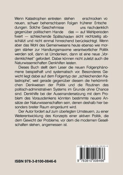 ,Uber die griiBten Probleme haben wir heute noch nichts als Hypothesen. Aber wir verlangen Beweise von uns . . . lch bin also gezwungen, die Locher in meinem Wissen auszustopfen . . . meine Wissenschaft ist noch wiBbegierig! . . . Unsere Un wissenheit ist unendlich, tragen wir einen Kubikmillimeter ab! Wozu jetzt noch so klug sein wollen, wenn wir endlich ein klein wenig weniger dumm sein kon nen! . . . Es setzt sich our soviel Wahrheit durch, als wir durchsetzen; der Sieg der Vernunft kann our der Sieg der Verniinftigen sein . . . " (Bert Brecht: Leben des Galilei) Wir miissen umdenken und nach vorn denken Iemen. Wir konnen uns nicht mehr mit Programm-und Wirkungsforschung begniigen, seitdem unser Tun und Unterlassen auch schleichende und dann unbeherrschbare Folgen hervor rufen kann und wir oeshalb erstmals fiir die Zukunft der nach uns Kommen den verantwortlich werden (Nachweltschutz). Neuartige Folgen begriinden neues Denken und fordern zu aktiver, voraus eilender Politik auf. Freilich - wir haben so unsere Erfahrungen! Die gro6en Entwiirfe, die guten Absichten und die modernen Instrumente konnen nicht bestehen, wenn es die gesellschaftlichen Rahmenbedingungen verhindern, daB sich ein ,Interesse" an der Zukunft entwickelt. Jetzt aber befinden wir uns in einer neuen Lage, in der wenigstens zuniichst das Bestandsinteresse der entwickelten lndustriegesellschaft beriihrt wird. Wenn bisher unvorstellbare Katastrophen eintreten oder als allmiihliche Spiit entwickler erkennbar werden, stehen wir erschrocken vor neuartigen, oft nur schwer beherrschbaren Folgen friiherer Entscheidungen.