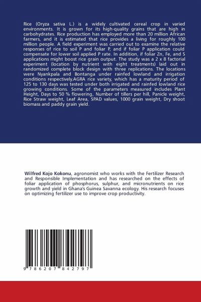 Rice (Oryza sativa L.) is a widely cultivated cereal crop in varied environments. It is grown for its high-quality grains that are high in carbohydrates. Rice production has employed more than 20 million African farmers, and it is estimated that rice provides a living for roughly 100 million people. A field experiment was carried out to examine the relative responses of rice to soil P and foliar P, and if foliar P application could compensate for lower soil applied P rate. In addition, if foliar Zn, Fe, and S applications might boost rice grain output. The study was a 2 x 8 factorial experiment (location by nutrient with eight treatments) laid out in randomized complete block design with three replications. The locations were Nyankpala and Bontanga under rainfed lowland and irrigation conditions respectively.AGRA rice variety, which has a maturity period of 125 to 130 days was tested under both irrigated and rainfed lowland rice growing conditions. Some of the parameters measuredincludes Plant Height, Days to 50 % flowering, Number of tillers per hill, Panicle weight, Rice Straw weight, Leaf Area, SPAD values, 1000 grain weight, Dry shoot biomass and paddy grain yield.