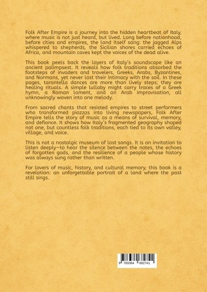 Folk After Empire is a journey into the hidden heartbeat of Italy, where music is not just heard, but lived. Long before nationhood, before cities and empires, the land itself sang: the jagged Alps whispered to shepherds, the Sicilian shores carried echoes of Africa, and mountain caves kept the voices of the dead alive.This book peels back the layers of Italy's soundscape like an ancient palimpsest. It reveals how folk traditions absorbed the footsteps of invaders and travelers, Greeks, Arabs, Byzantines, and Normans, yet never lost their intimacy with the soil. In these pages, tarantella dances are more than lively steps; they are healing rituals. A simple lullaby might carry traces of a Greek hymn, a Roman lament, and an Arab improvisation, all unknowingly woven into one melody.From sacred chants that resisted empires to street performers who transformed piazzas into living newspapers, Folk After Empire tells the story of music as a means of survival, memory, and defiance. It shows how Italy's fragmented geography shaped not one, but countless folk traditions, each tied to its own valley, village, and voice.This is not a nostalgic museum of lost songs. It is an invitation to listen deeply-to hear the silence between the notes, the echoes of forgotten gods, and the resilience of a people whose history was always sung rather than written.For lovers of music, history, and cultural memory, this book is a revelation: an unforgettable portrait of a land where the past still sings.