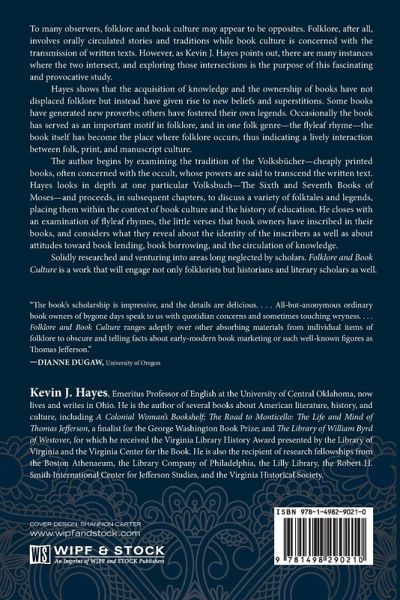 To many observers, folklore and book culture may appear to be opposites. Folklore, after all, involves orally circulated stories and traditions while book culture is concerned with the transmission of written texts. However, as Kevin J. Hayes points out, there are many instances where the two intersect, and exploring those intersections is the purpose of this fascinating and provocative study. Hayes shows that the acquisition of knowledge and the ownership of books have not displaced folklore but instead have given rise to new beliefs and superstitions. Some books have generated new proverbs; others have fostered their own legends. Occasionally the book has served as an important motif in folklore, and in one folk genre--the flyleaf rhyme--the book itself has become the place where folklore occurs, thus indicating a lively interaction between folk, print, and manuscript culture. The author begins by examining the tradition of the Volksbucher--cheaply printed books, often concerned with the occult, whose powers are said to transcend the written text. Hayes looks in depth at one particular Volksbuch--The Sixth and Seventh Books of Moses--and proceeds, in subsequent chapters, to discuss a variety of folktales and legends, placing them within the context of book culture and the history of education. He closes with an examination of flyleaf rhymes, the little verses that book owners have inscribed in their books, and considers what they reveal about the identity of the inscribers as well as about attitudes toward book lending, book borrowing, and the circulation of knowledge. Solidly researched and venturing into areas long neglected by scholars. Folklore and Book Culture is a work that will engage not only folklorists but historians and literary scholars as well.