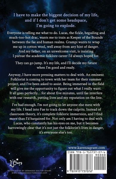 Grappling with the biggest decision of my life whilst fending off a goblin onslaught is my own special kind of chaos. It's almost midsummer, the weather is baking, and I'm hot and bothered by Lucas, the fickle and much-too-attractive drac, who is insisting I train as Keeper of the Bounds between the fae and human realms. It's an enticing choice, but I can't deny the part of me that hankers after an academic-folklore career. When an eminent Folklorist comes to town with her team for their summer research project. I have the chance to assist and figure out what I really want. It all goes perfectly... for about five minutes, until goblins mess with our research. Add to that a load of irate golden-horned sheep, an introverted cyclops, and half a ton of glitter (most of it in my hair-don't ask), and my opportunity for a little peaceful reflection is well and truly scuppered. What's more, my reputation and the team's lives are on the line. Now, I'm not just hot and bothered, I'm ready to explode. My only solution is to head into Fae with Lucas to track down the culprits. But close proximity to an incubus is never a good thing. After a number of, um... distractions, we discover that it's not just the folklorist's lives in danger, it's everyone else's too.