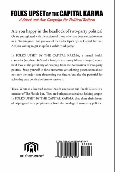 In Folks Upset by the Capital Karma, a mental health counselor (sex therapist!) and a family law attorney (divorce lawyer!) take a hard look at the possibility of escaping from the domination of two-party politics. Strap yourself in for a humorous yet sobering presentation about not only the major issue threatening our future, but also the potential for achieving true political reform to resolve it.